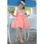 Kız Çocuk Parlak Pulpayet İşlemeli V Yaka Eteği Kat Kat Tüllü Somon Abiye